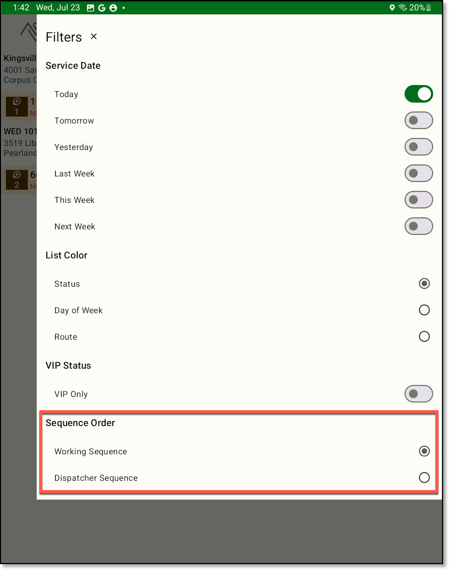 A new Sequence Order toggle has been added to the Filters screen, allowing drivers to choose how stops are sequenced. Selecting "Working Sequence" updates the next stop to be labeled as '1' each time a stop is completed. Alternatively, selecting "Dispatch Sequence" displays the same sequence numbers shown in Dispatch.