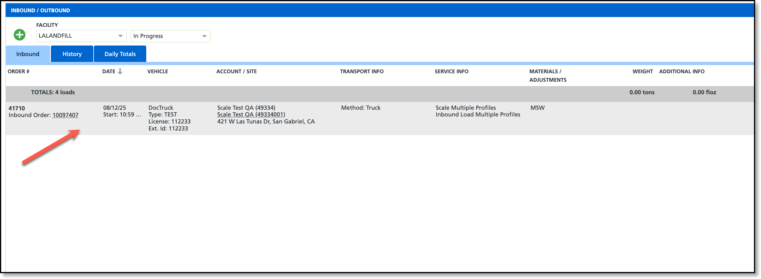 Once an inbound ticket is created, it will appear in the Inbound screen for the facility where it was recorded.
