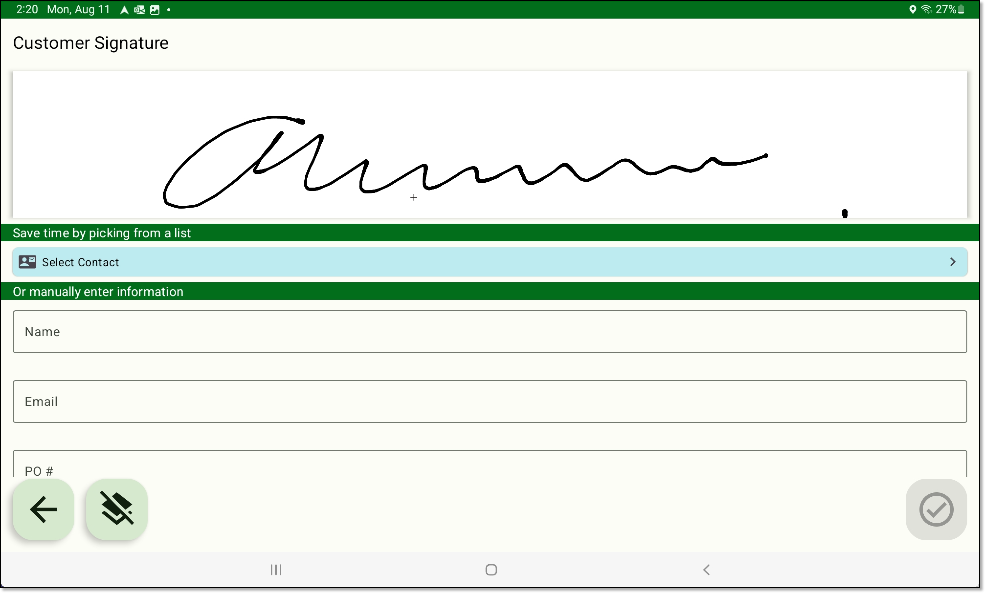 Previously in NavuNav, the Customer Signature screen did not respect permissions 257 (Add Contact) and 258 (Edit Contact), allowing drivers to add or edit a contact even when these permissions were set to “Not Authorized.” This has been resolved.