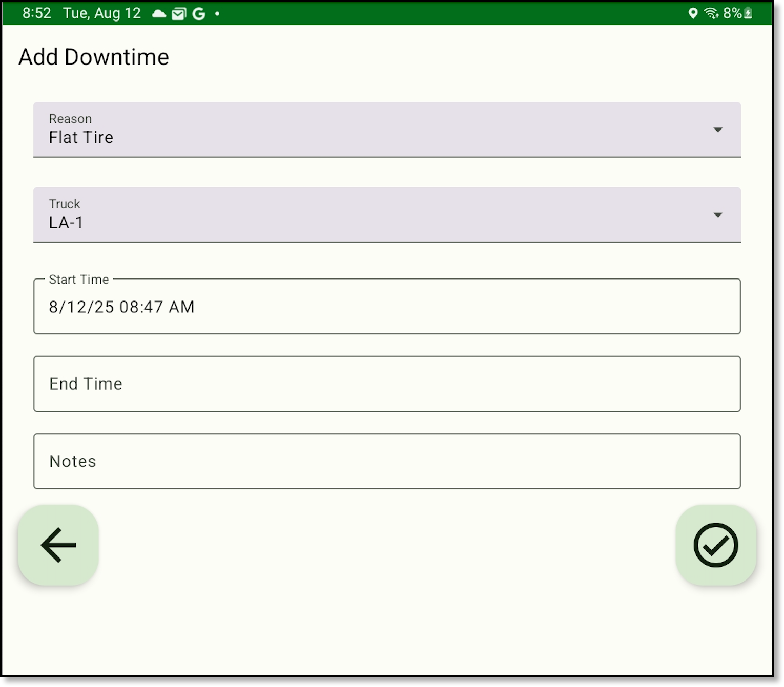 The Downtime screen logic has been updated to allow users to save a downtime without specifying an End Time. While a downtime is in progress, the option to add another downtime will be inactive.