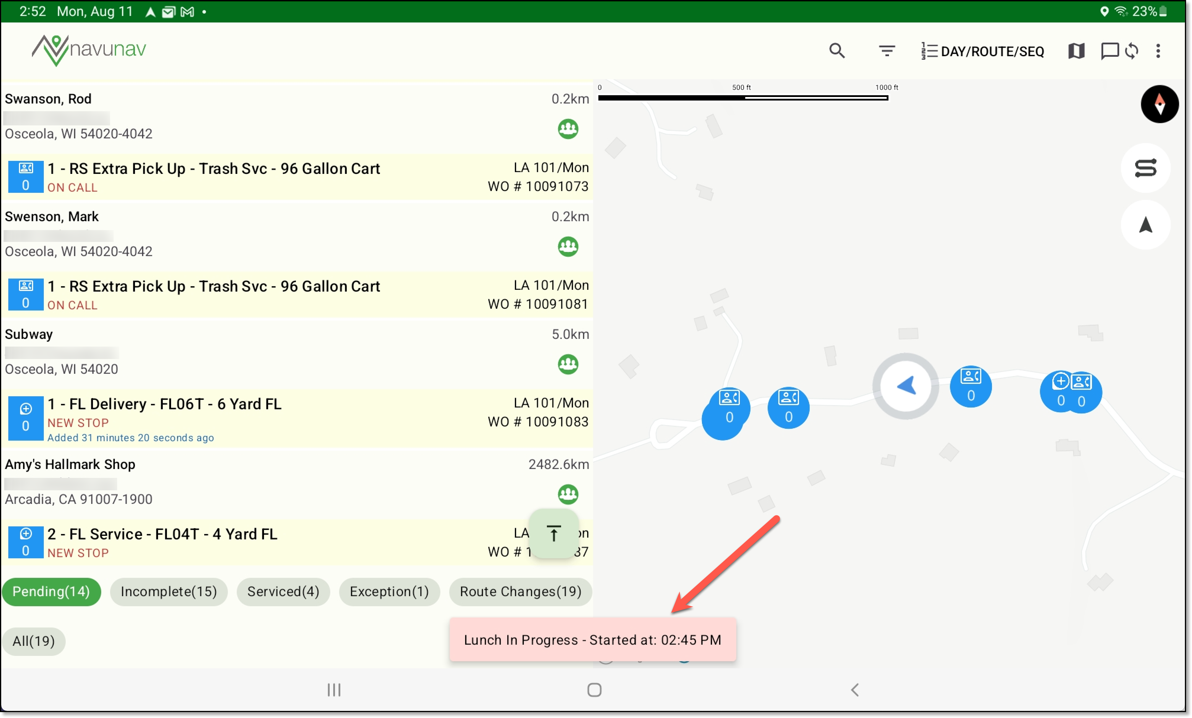 The Lunch Time logic has been updated to allow users to navigate away from the Lunch Time screen after starting lunch. If lunch is in progress and the user navigates away, a “Lunch In Progress” message will now appear at the bottom of the List/Service Detail screen. Additionally, a Lunch End option has been added to the app menu to record when lunch has ended.