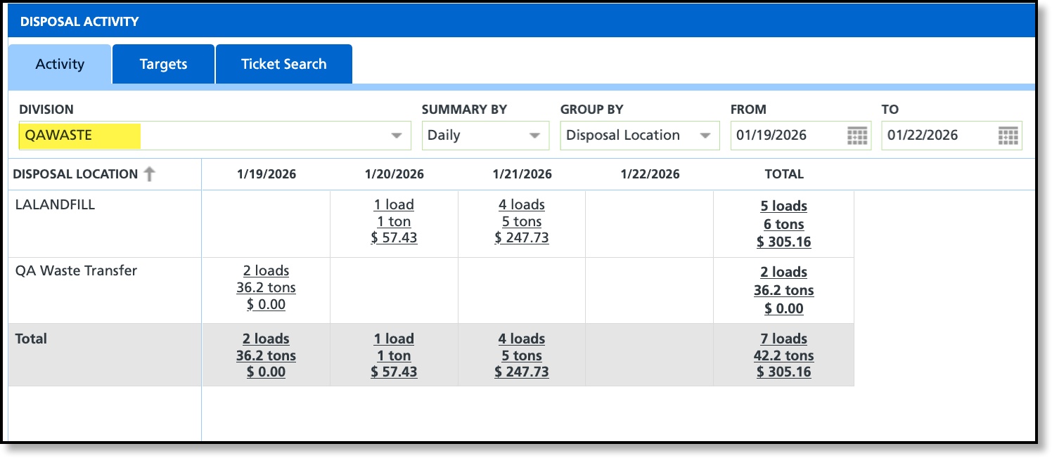 The Division filter has been updated to ensure disposal records are filtered based on the appropriate division. When a disposal ticket is associated to a work order, the filter is applied using the division associated to the site. When a disposal ticket is associated to a route, the filter is applied using the division associated to the disposal location or facility.