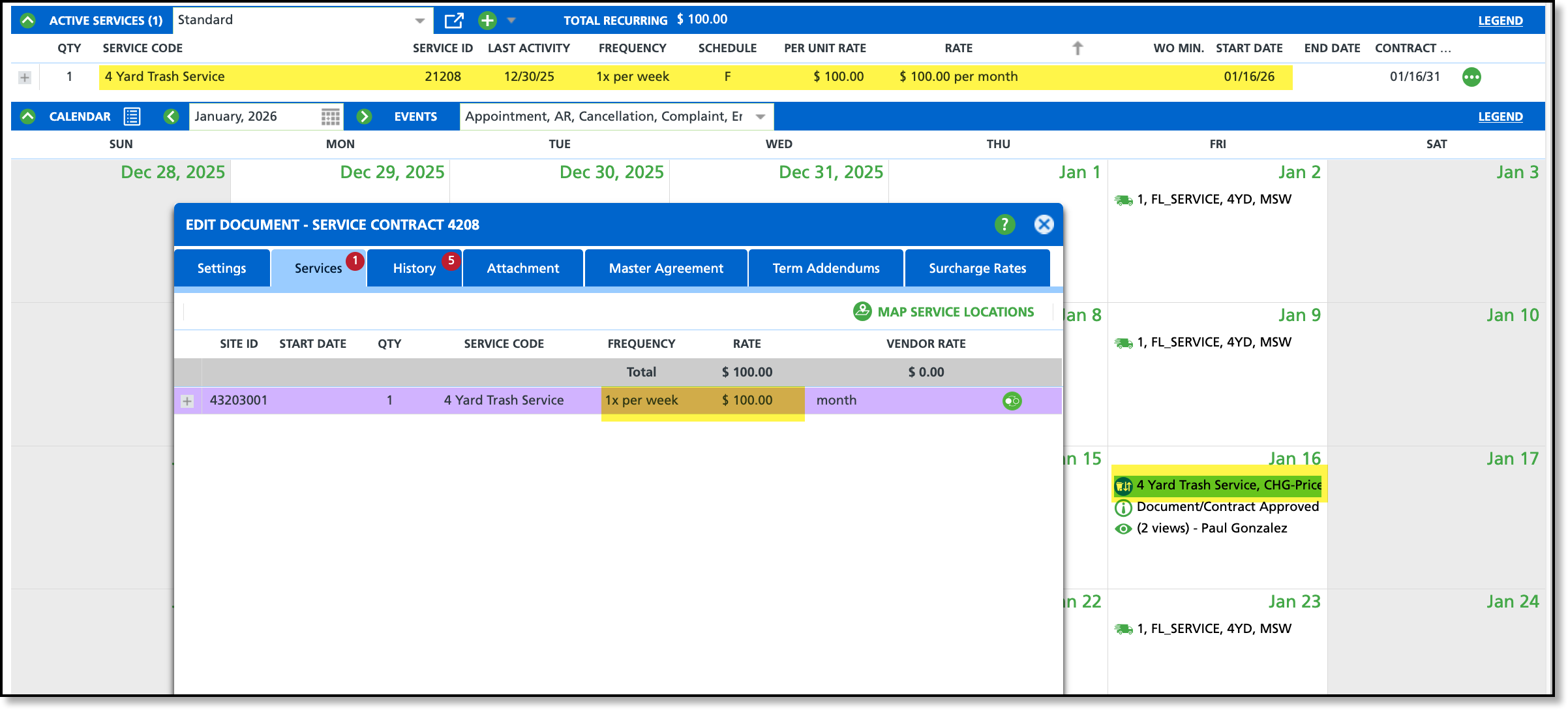 An issue has been resolved where posting a service change from a Service Agreement (Order/Proposal) could result in the service frequency and routing being removed from the Active Services record. In these cases, the service rate was updated correctly, but the associated frequency and routing information disappeared, causing the service to no longer schedule properly.