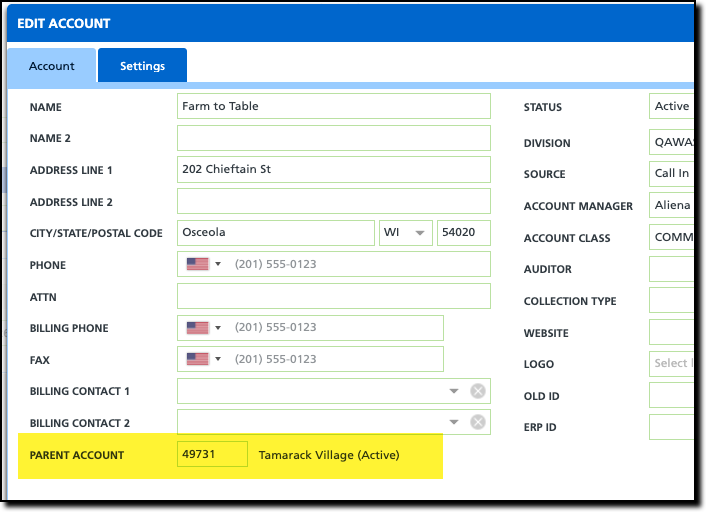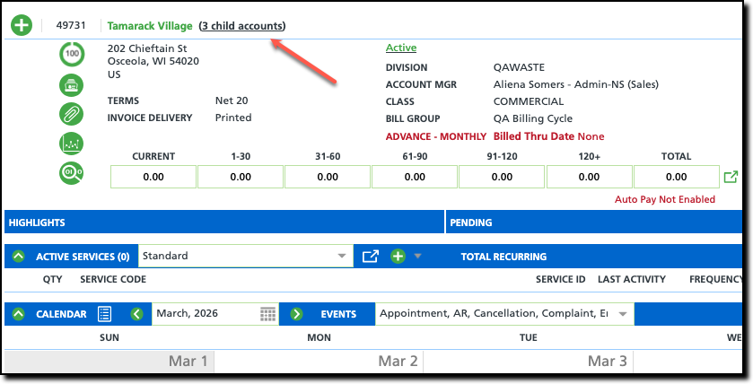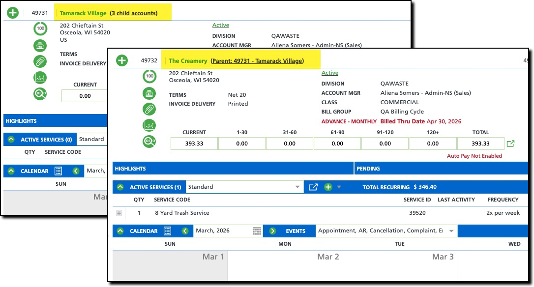 To accommodate accounts with multiple sites where each require a separate AR History, an account can be established as a “Parent” account with child accounts linked to it. This allows each site to maintain its own AR Aging, while also providing added flexibility in areas such as billing.