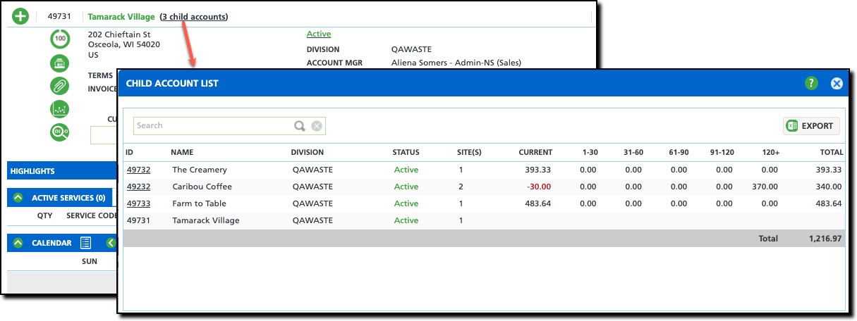 To view all child accounts linked to a parent account, select the child account hyperlink. This will open the Child Account List, which includes a summary of each account’s AR aging status.