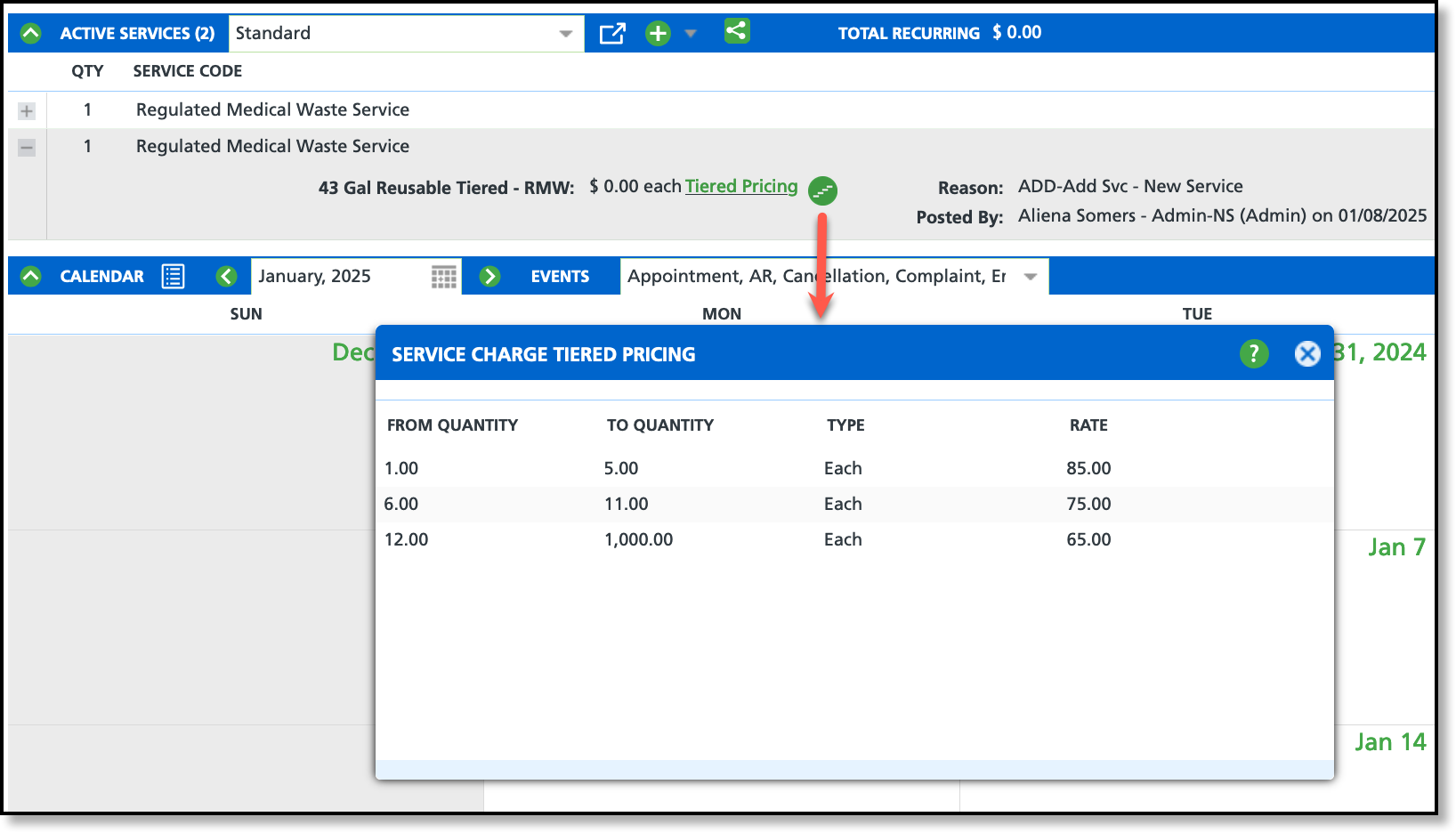 Previously, in the Active Services section of the Customer Service screen, the current pricing displayed in purple if a future site service charge existed, and the future change not shown. With this update, service charge rates with a future increase display in purple, with the Effective Date and future charge amount.