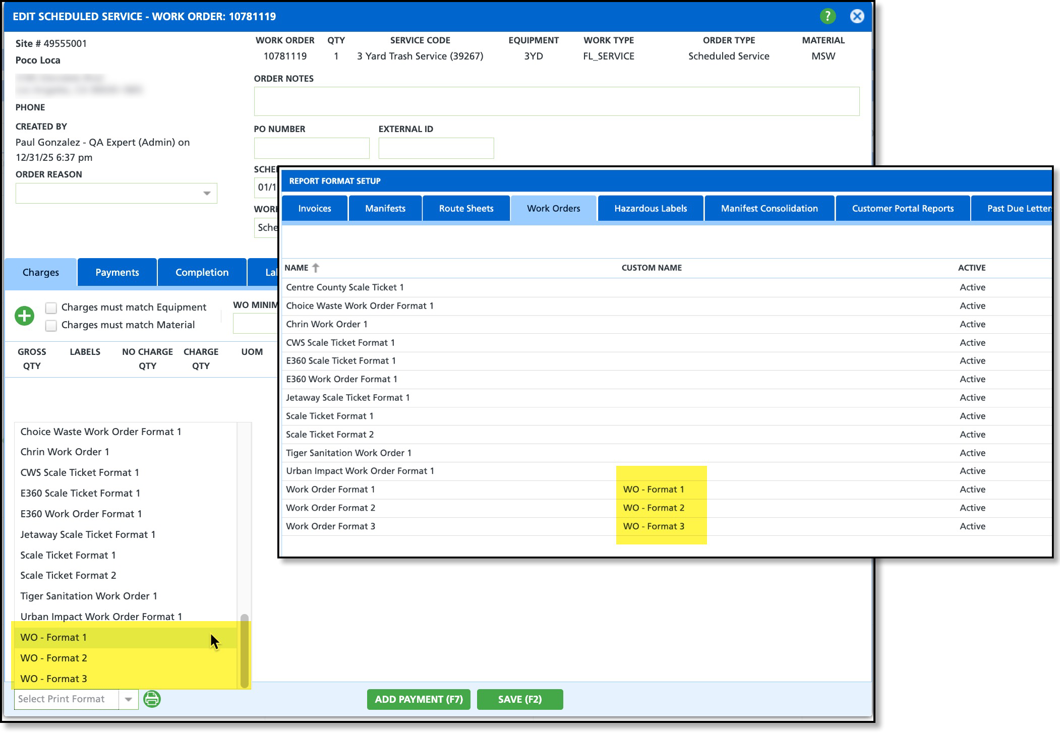An issue has been resolved that prevented a custom work order name from displaying in the Print Format drop-down on the service record.