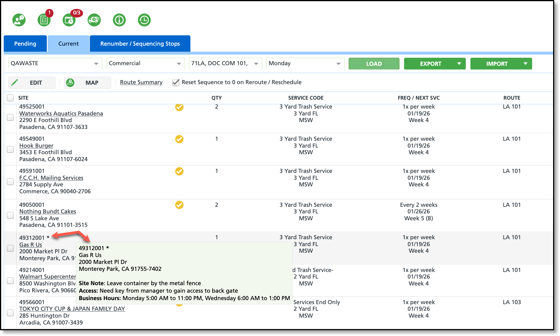An enhancement has been applied to the Pending and Current screens of Route Management to improve visibility of site notes, access notes, and business hours. If any of this information exists for a site, an asterisk is displayed after the site ID and the details are shown on hover.