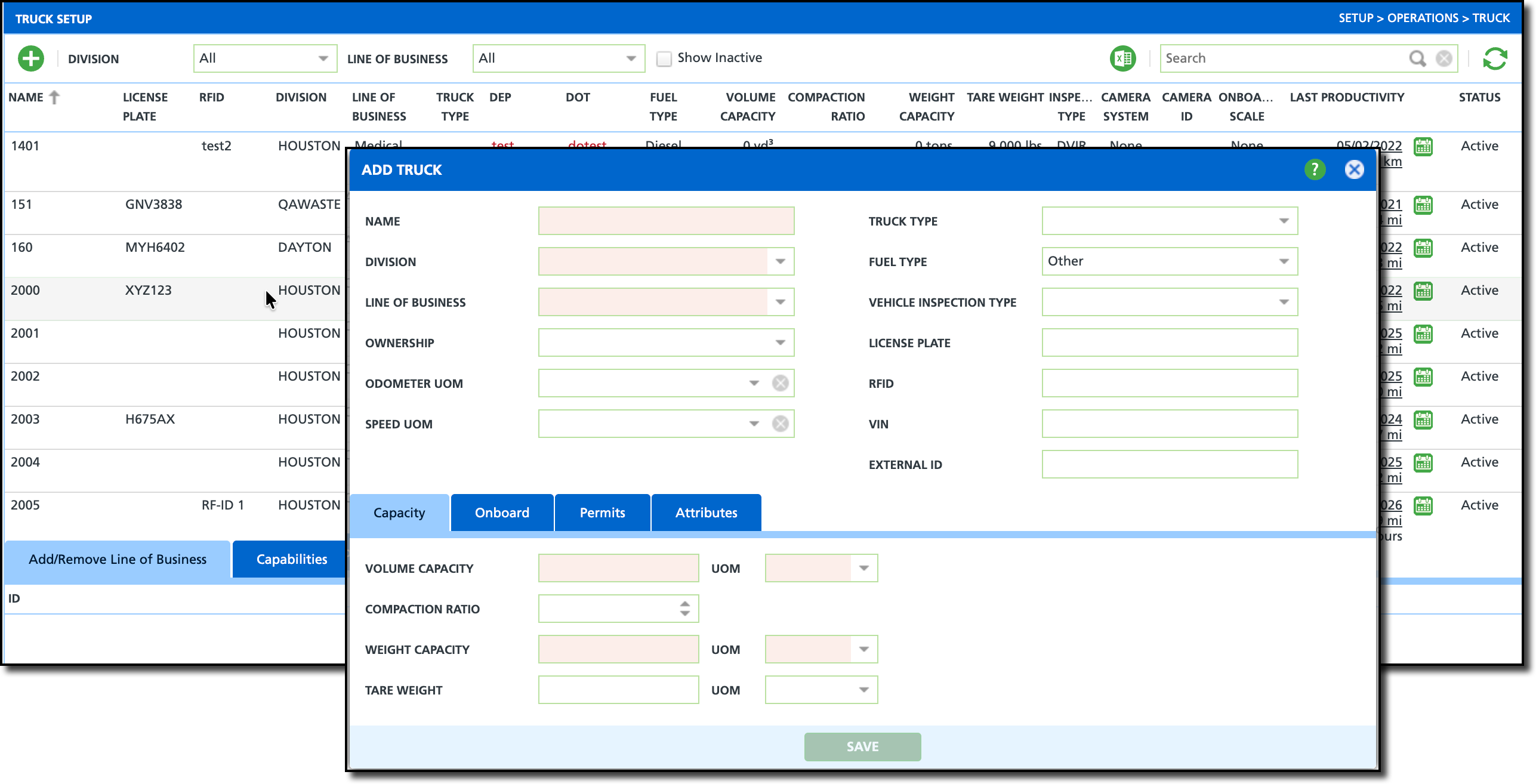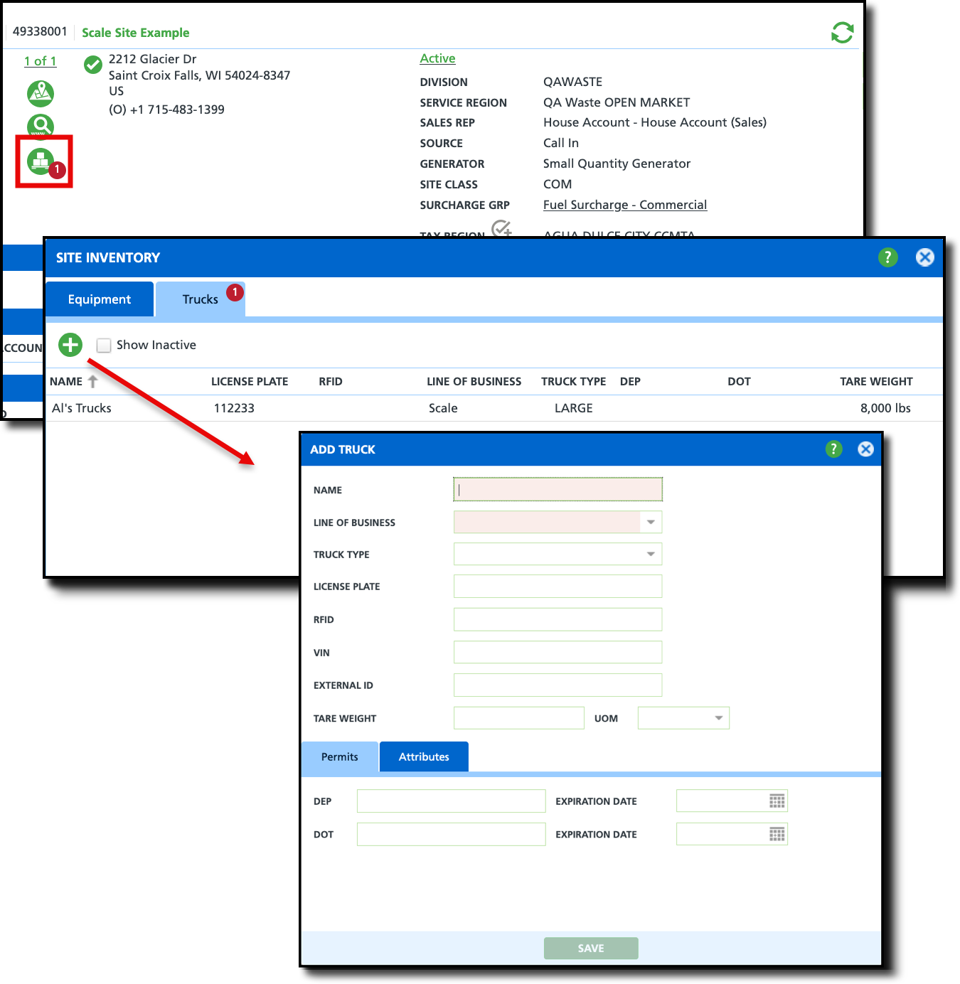 Trucks can be added in two ways: through Truck Setup where they will appear in the Truck drop down on inbound work orders, or in Site Inventory to define authorized customer trucks that can be searched. Setup > Operations > Truck and Customer Service Screen > Site Details > Site Inventory > Trucks (tab) Add trucks in Truck Setup to include them on inbound work orders. Trucks added here will appear in the Truck drop down on the Inbound Order screen and streamline the process with pre-defined tare weights. Additional information about the Truck Setup screen can be reviewed here: Truck Setup. Pathway: Customer Service Details > Site Inventory > Trucks [tab] Add trucks to a site’s inventory to define a customer’s authorized trucks and establish each truck’s tare weight for faster ticket processing. This setup also enables scale operators to quickly search for trucks across sites within the same division as the facility using details such as truck name or license plate number. Additional information about site inventory can be reviewed here: Site Inventory (Trucks) Truck Setup vs Site Inventory - Trucks