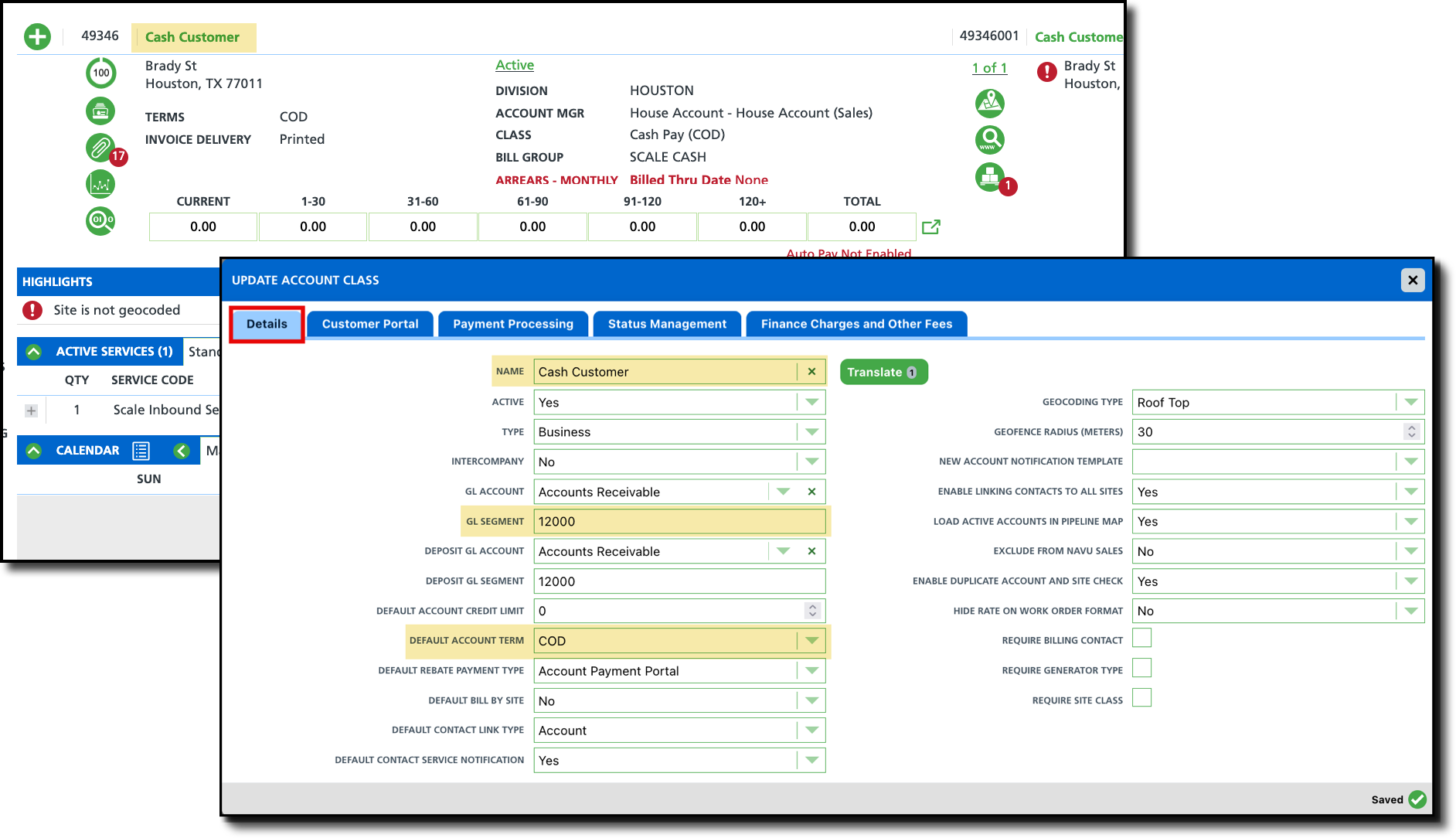Field Setup Account Class Select a previously created account class that applies to scale or cash-pay customers. Name Name the account with a name that can be easily searched by scale operators. Address Recommended: enter the address for the facility. Bill Group Select a previously created Bill Group that applies to cash-pay customers. Invoice By Email Select 'No' for this field. Term Select 'COD' (Cash on Delivery) to require the scale operator to collect payment before the Work Status can be changed to "Completed." Tax Region Select the tax region that applies to the facility's location. Setup: Assign Active Service to Cash Account