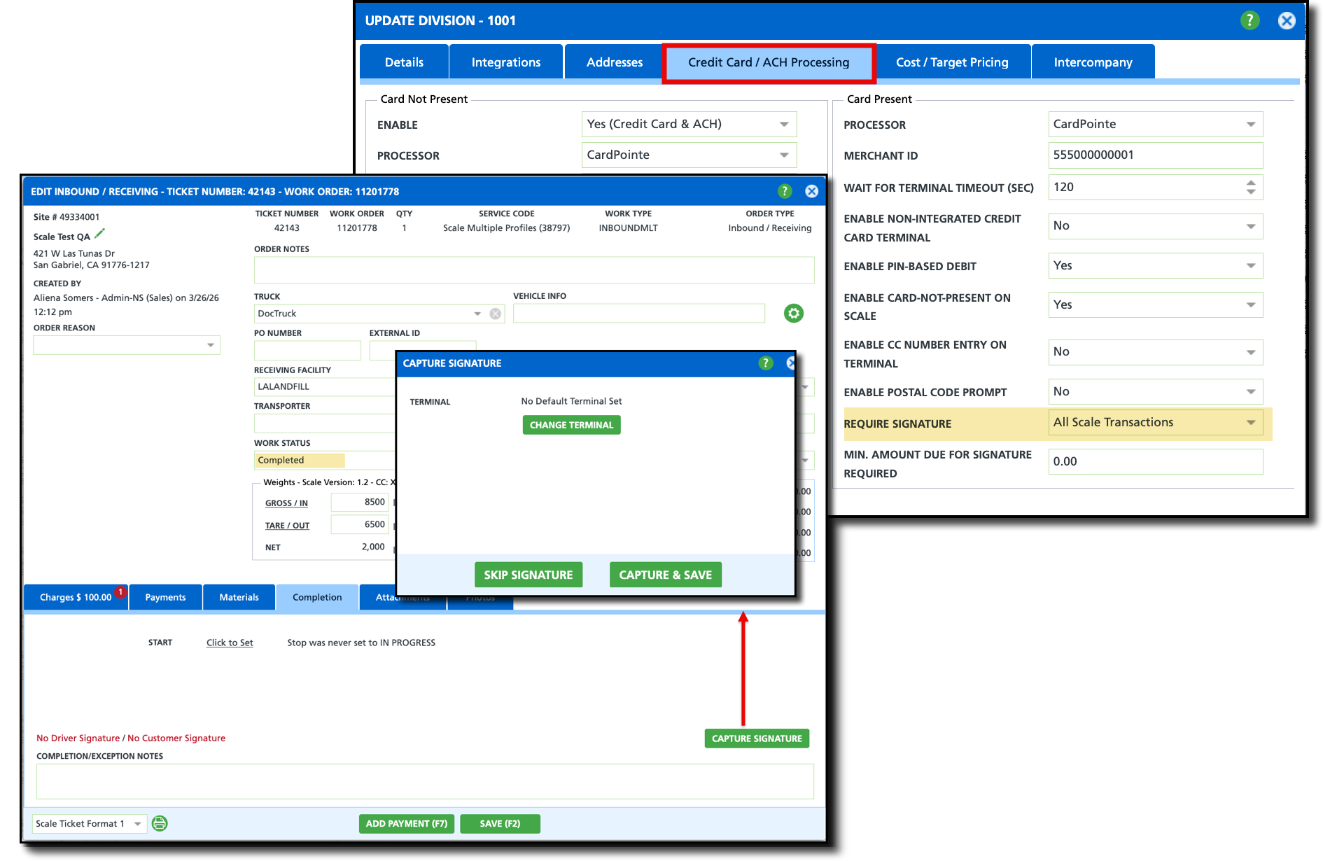 The option to capture a signature for all scale transactions when a payment does not exist is established at the Division level. Facilities with this setting configured should not capture a signature during the credit card payment. The signature is only required once at the end of the transaction. Additionally, the work order must have an Inbound or Outbound event type and marked as Complete.