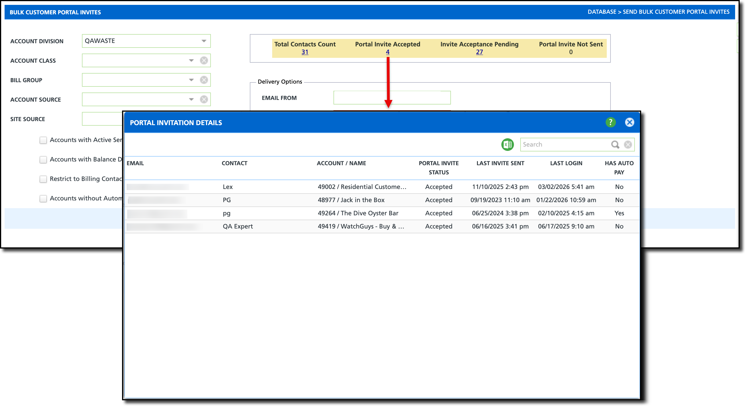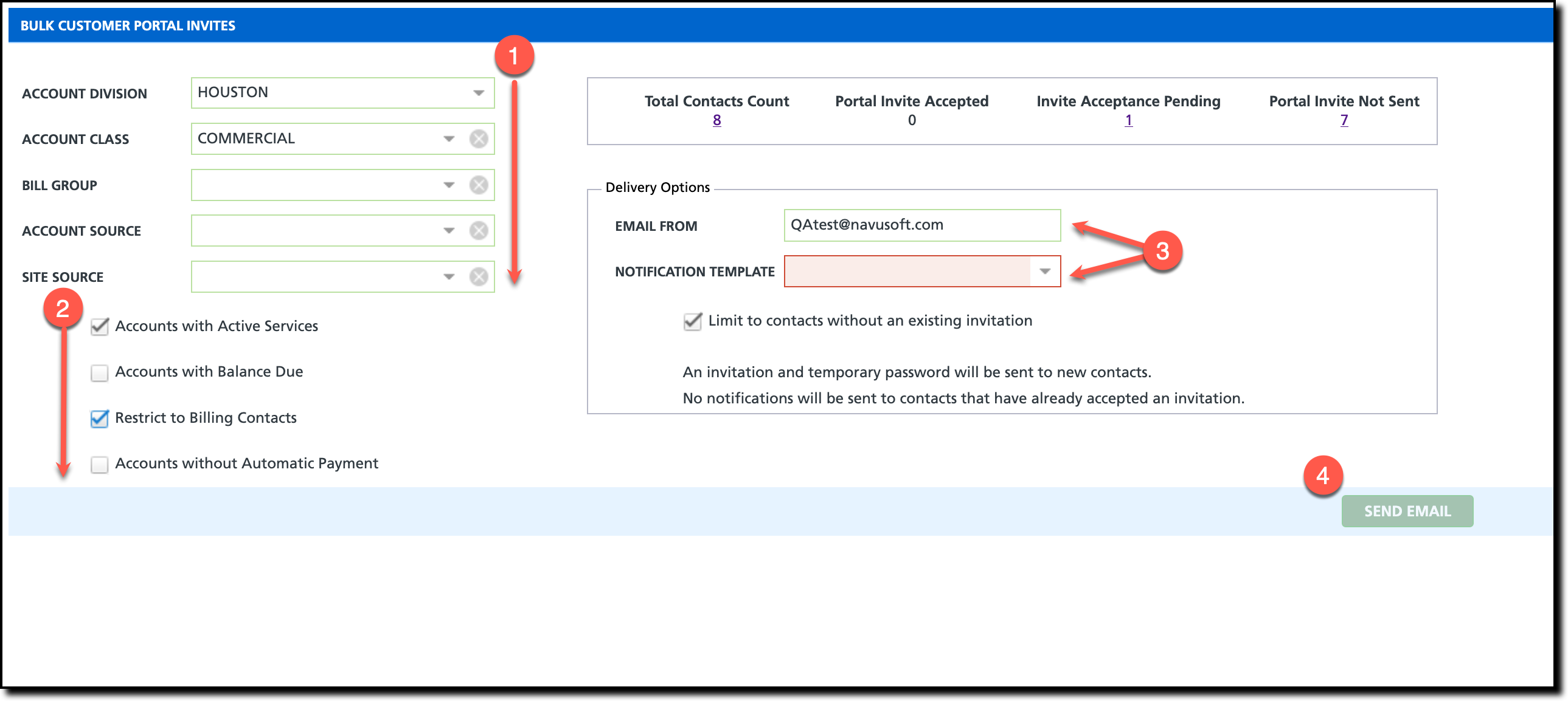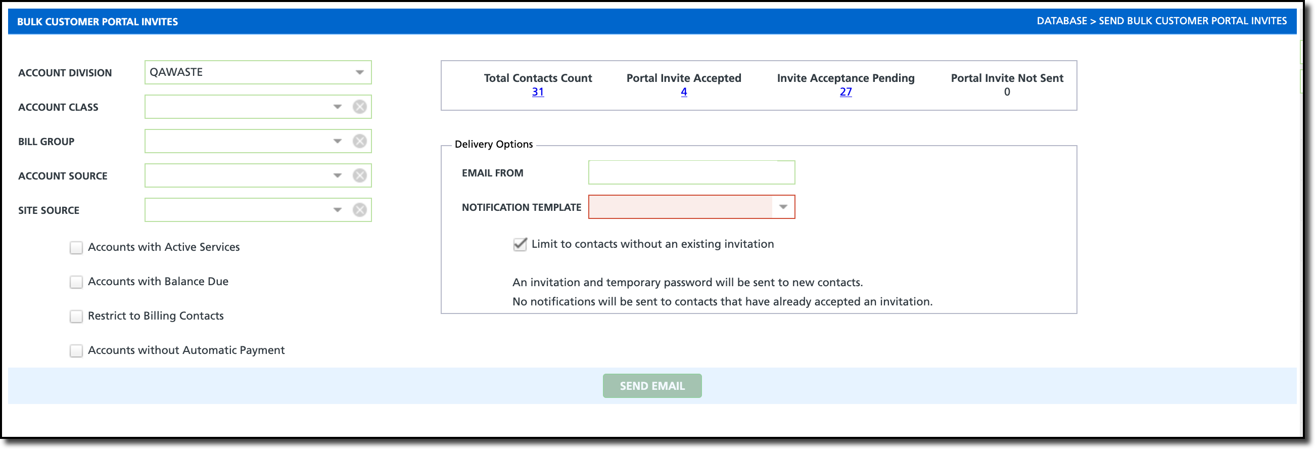 - Further narrow down who should receive the portal invite by selecting options from the Account Class, Bill Group, Account Source and Site Source drop down fields.