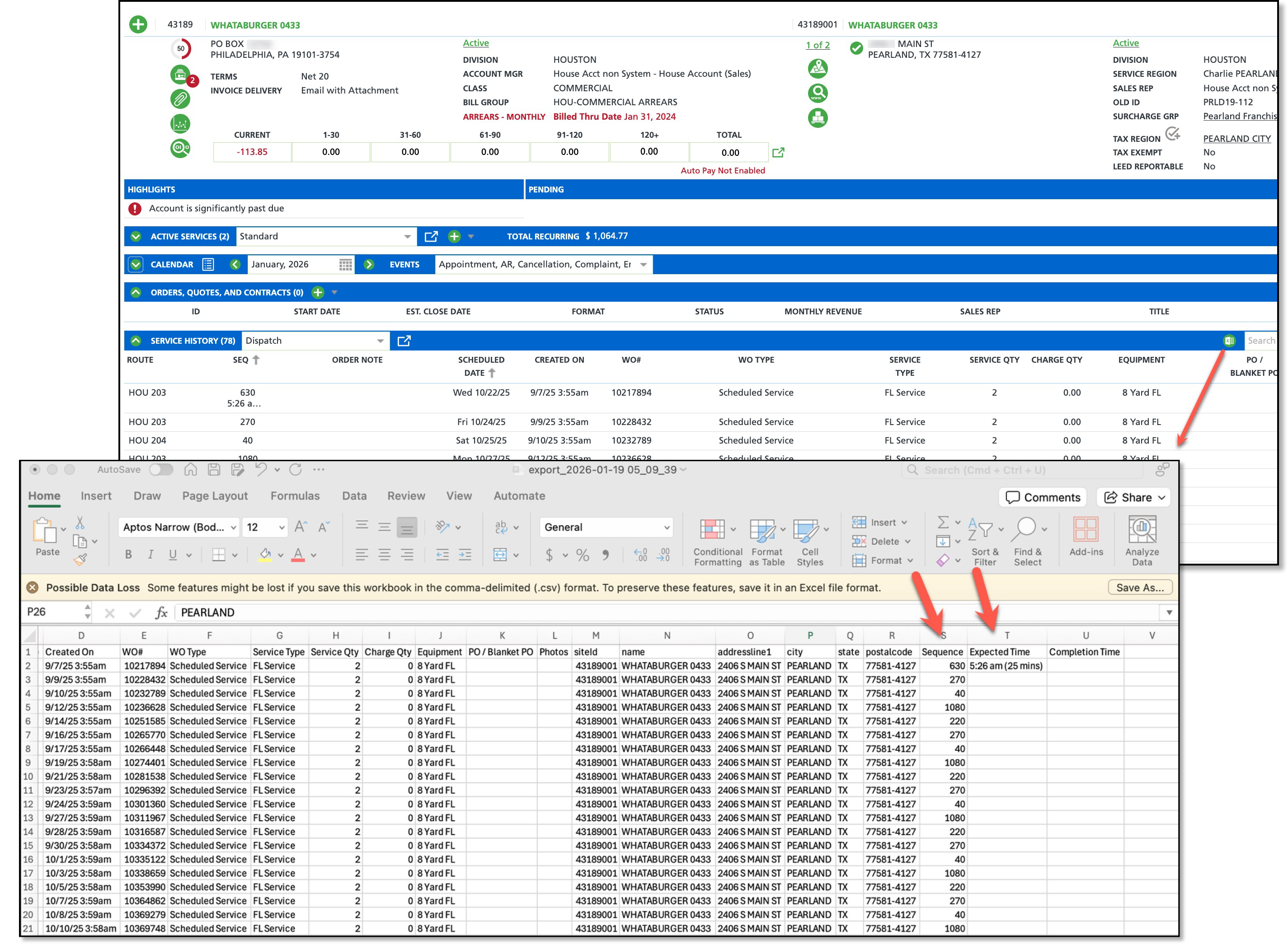 The Excel export from Customer Details > Service History has been updated to separate the Sequence and Completion Date/Time into distinct columns. Previously, both values were combined into the same column in the export file.