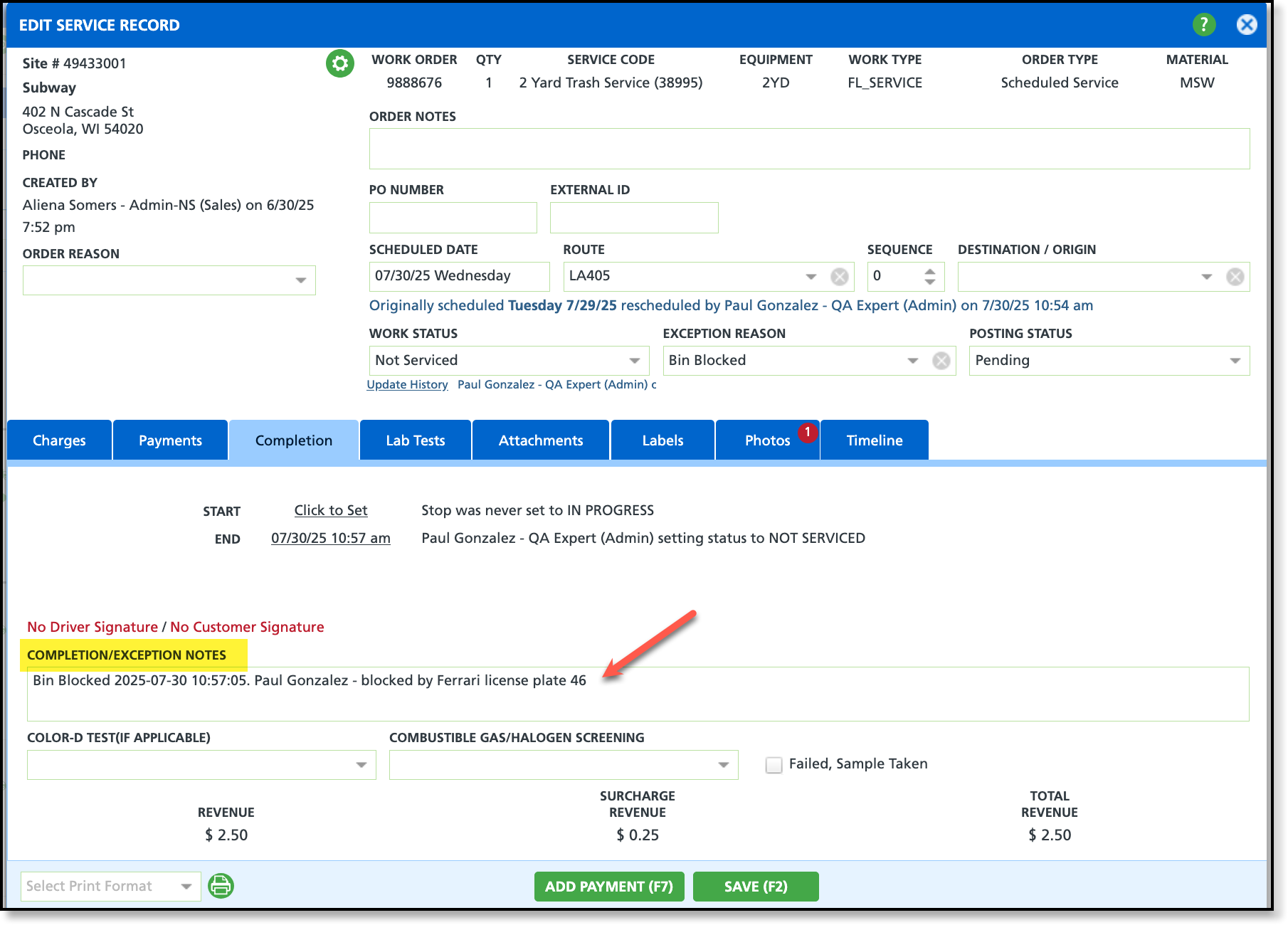An issue has been resolved where notes entered by the driver in NavuNav for stops marked with an Exception were not displaying in the Completion/Exception Notes field of the Service Record.