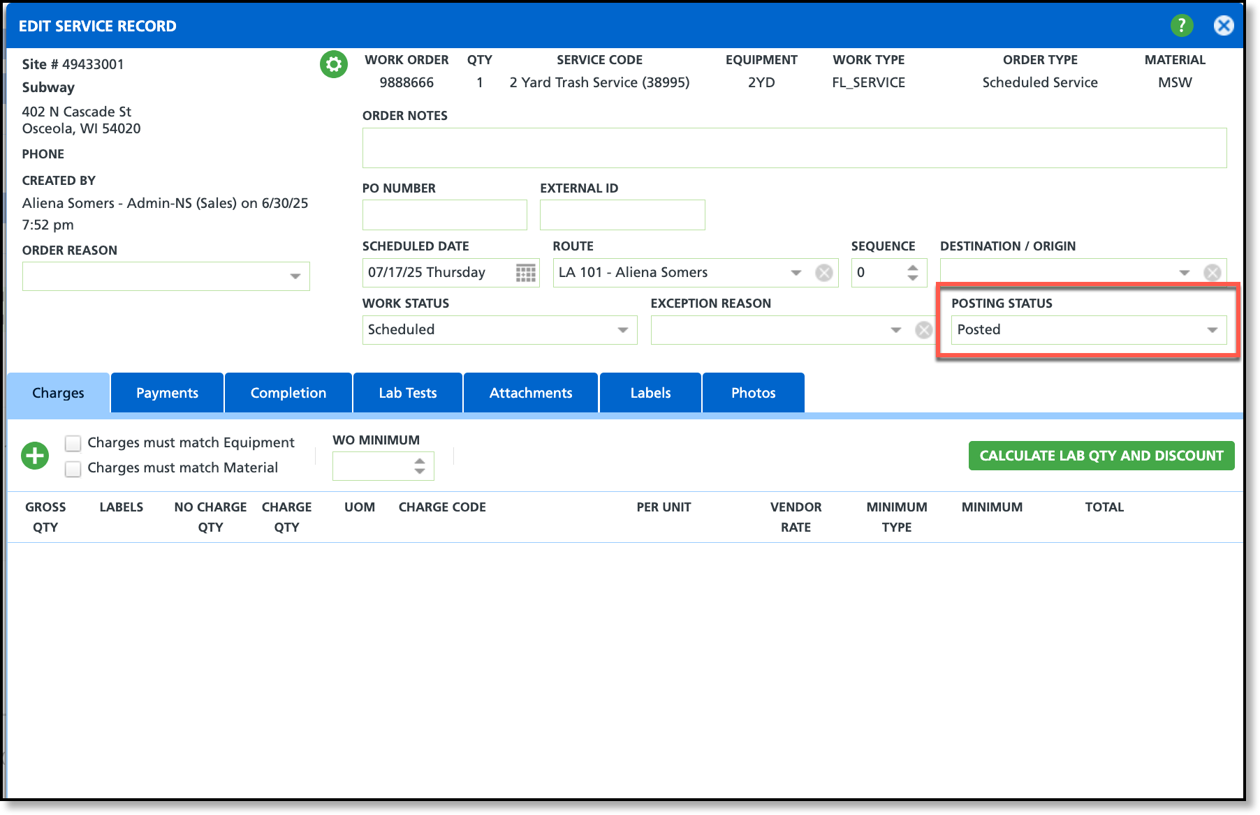 Posting status logic within the service record has been updated, affecting the following permissions: 341 (Change Work Order to Ready to Post), 342 (Change Work Order to Posted), and 472 (Reverse Work Order Posting Status).