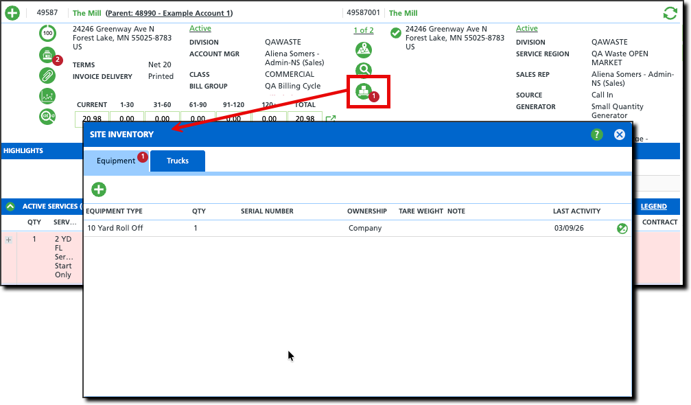 Site Inventory keeps track of the equipment and trucks used at a site. Users can use this feature to document equipment additions, removals, and transfers to other sites or a storage yard. For more comprehensive equipment tracking and management, the Inventory Management tool in the Operations module is available.