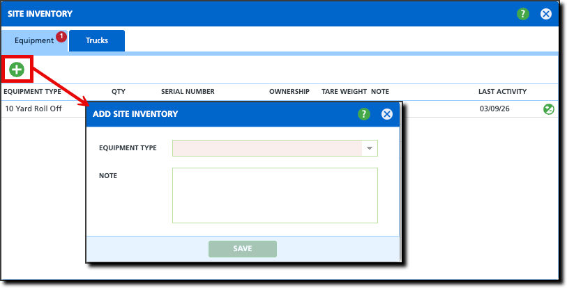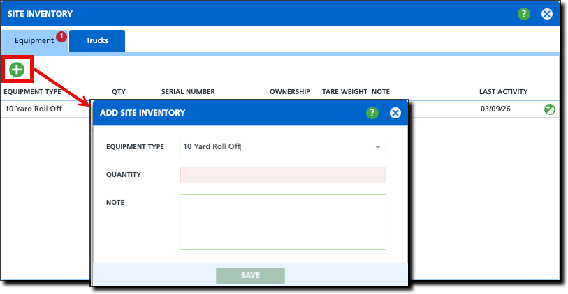 - Select the green "+" icon to open the Add Site Inventory popup.