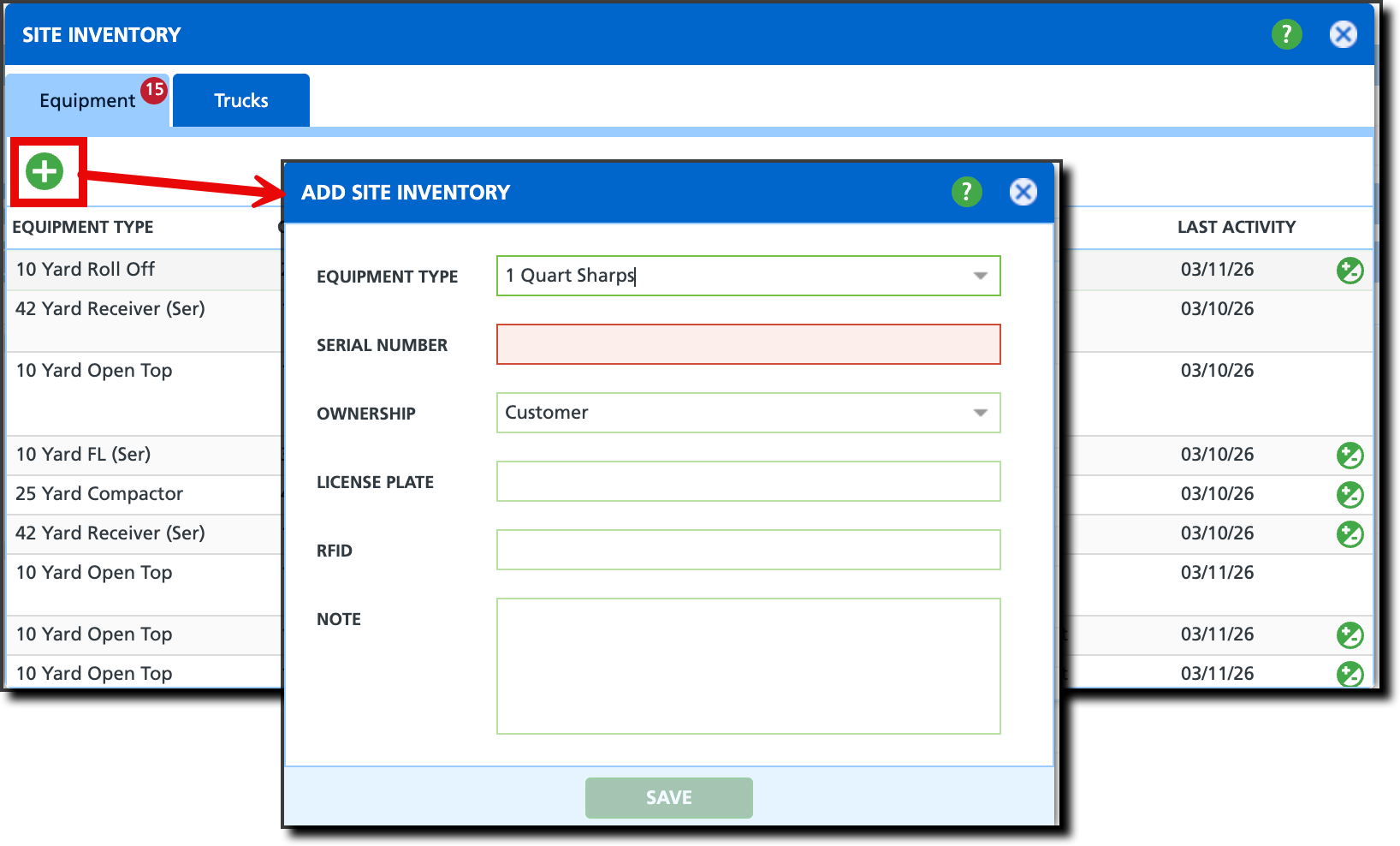 - Optional: add an internal Note that will display with the equipment in the inventory tools.