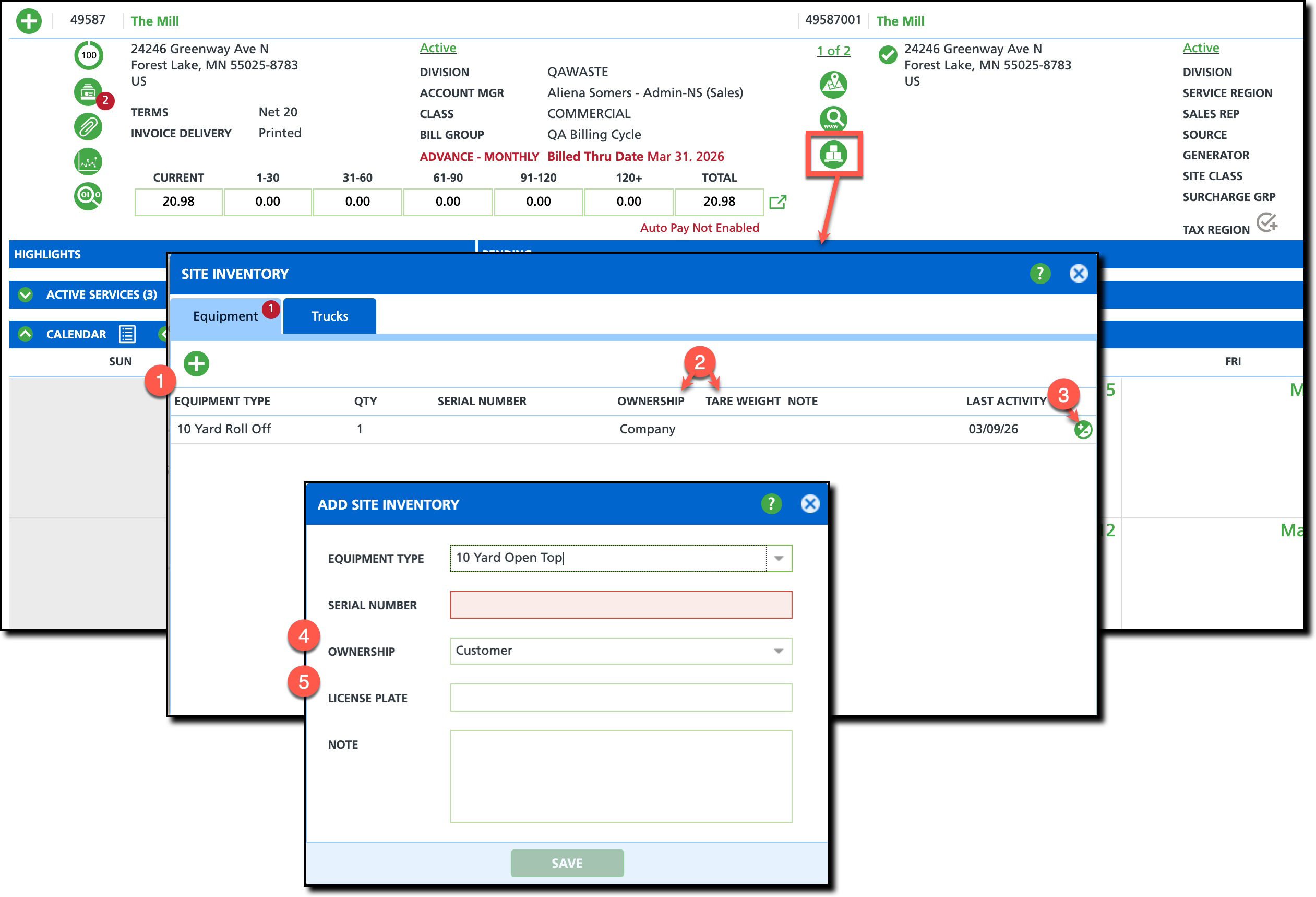 Pathway: Customer Service Screen > Site Inventory [Equipment tab]