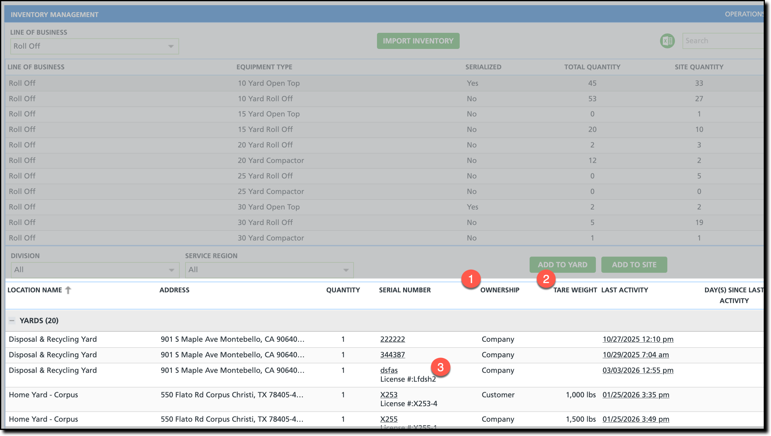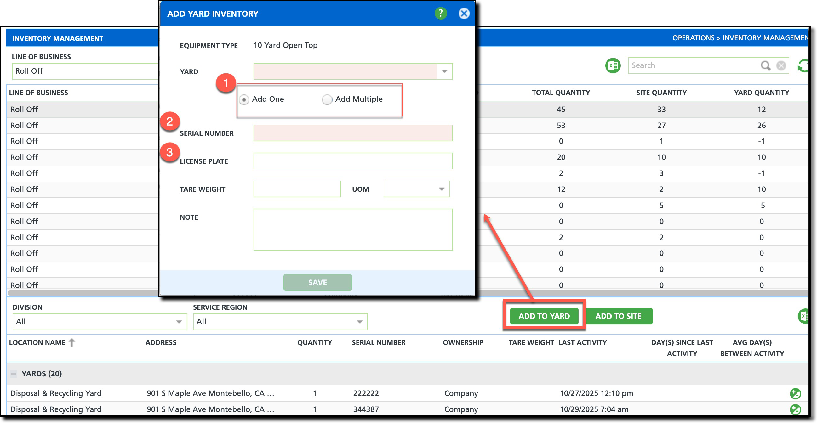 The following updates have been made to Inventory Management > Add Yard if the equipment type is serialized: