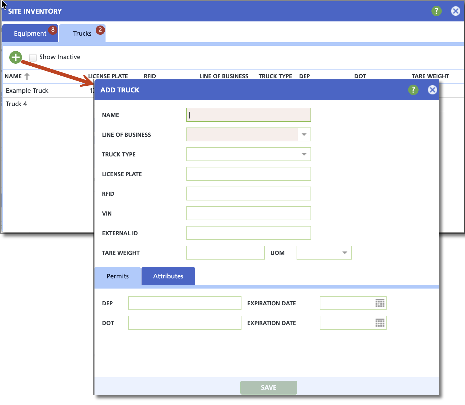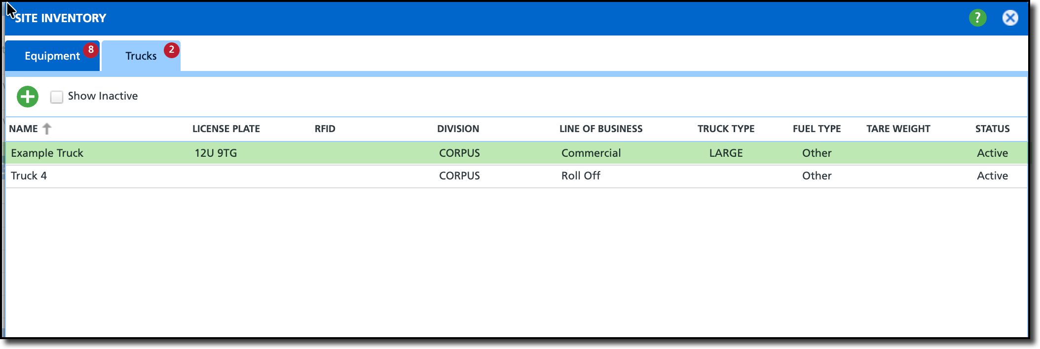 Site Inventory keeps track of the equipment and trucks used at a site. This article focuses on the Trucks tab of the Site Inventory tool used in the scale process. By including trucks within a site's inventory, the scale operator gains the ability to easily locate trucks and quickly generate disposal tickets.