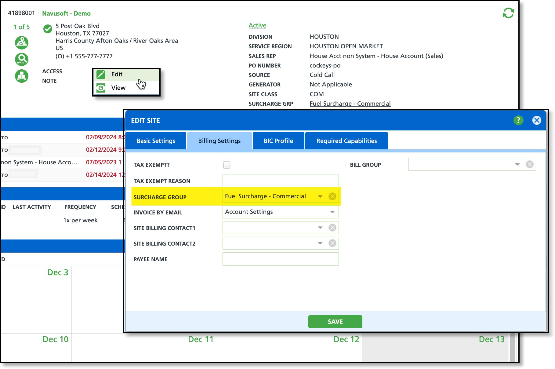 After a surcharge group has been created, it can be applied to a site's billing settings.