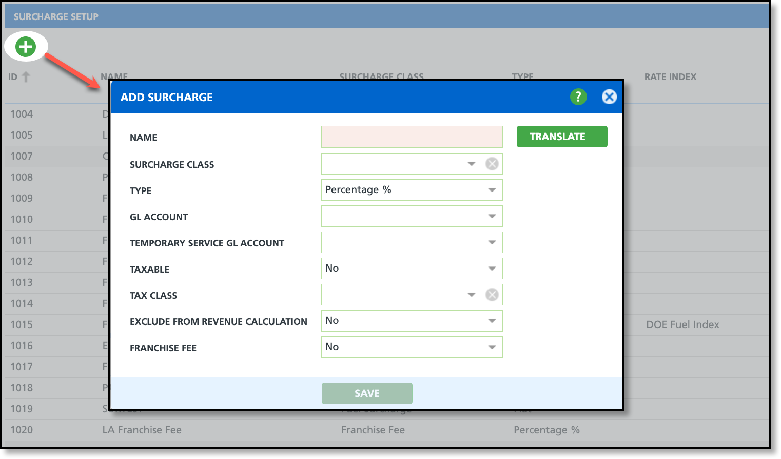 - Click the Add icon from the Surcharge Setup screen. This will display the Add Surcharge popup editor.
