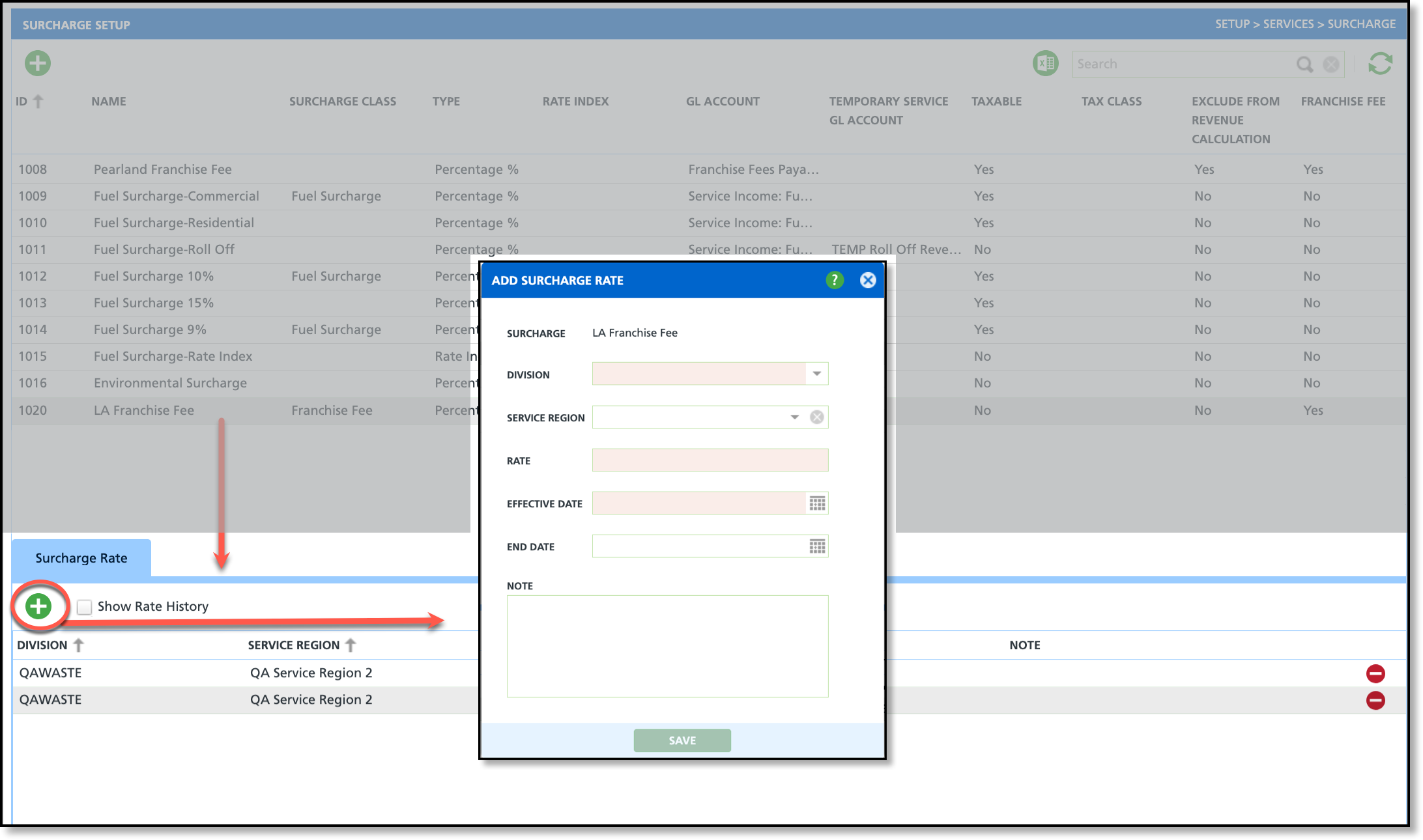 Once a surcharge is created, its rates can be applied based on division, service region, and effective dates.