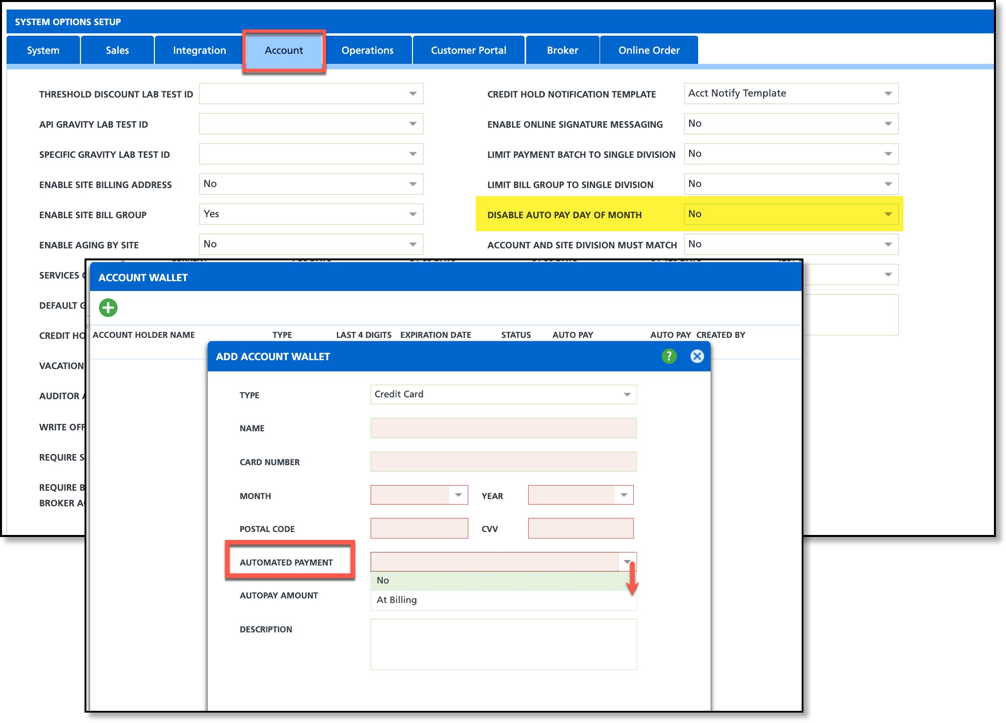 A new setting, 'Disable Auto Pay Day of Month', has been added to the Account tab in System Options Setup. When enabled (set to 'Yes'), the 'Scheduled Day' option and 'Day of Month' field are hidden in the Account Wallet in Navusoft and Customer Portal.