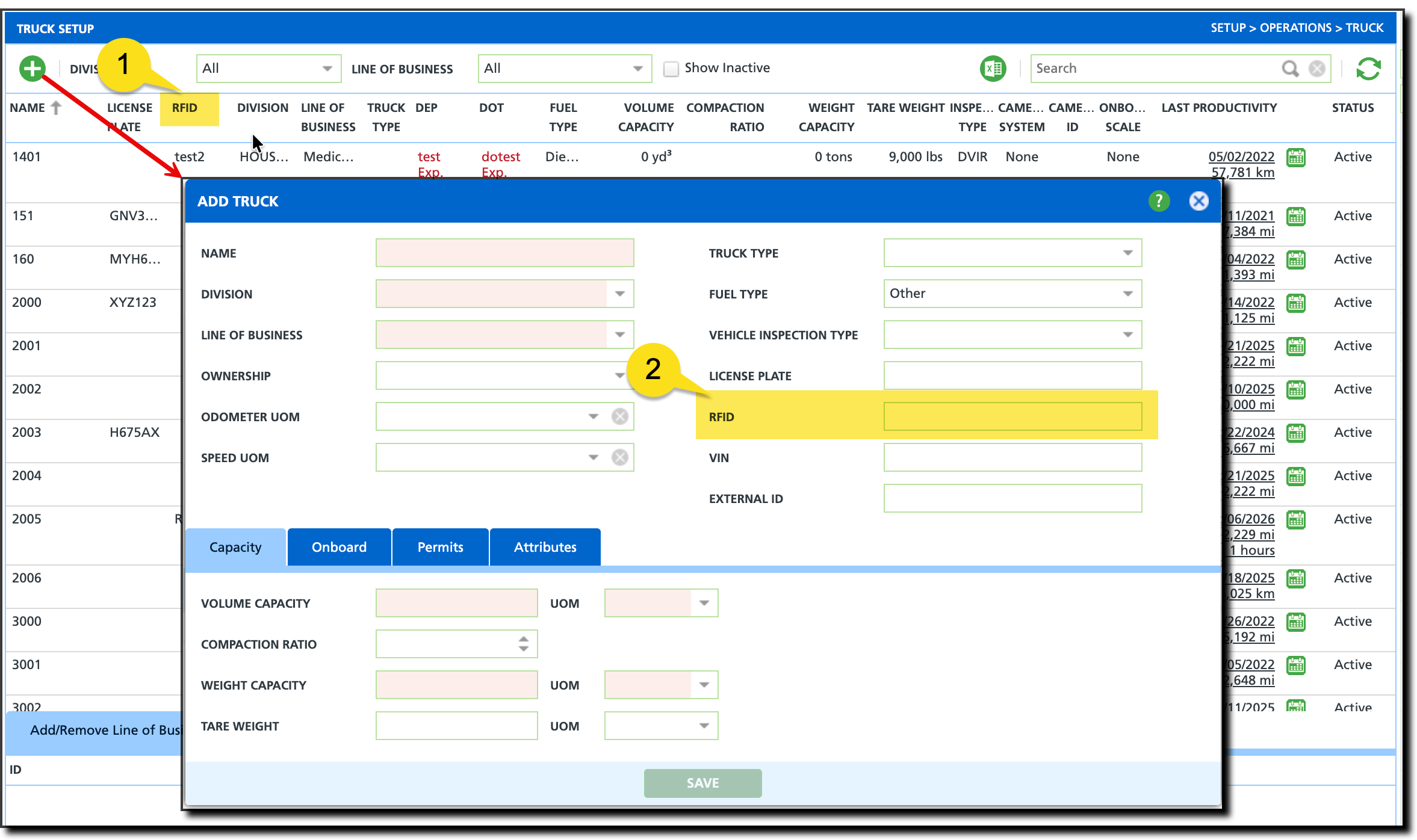 A new RFID (Radio Frequency Identifier) field has been added for trucks (internal or 3rd party) which allows tracking between a truck and its associated RFID transponder tag. The field is not mandatory but if entered, the RFID must be unique. If a duplicate is entered, an error message is displayed requesting a unique RFID.