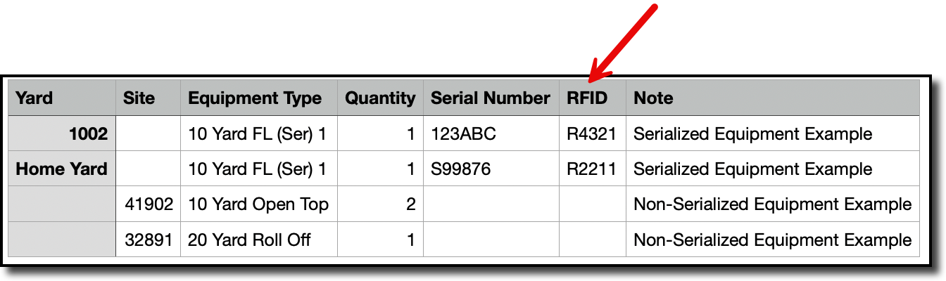 In the Equipment tab of Site Inventory, for serialized equipment, if an RFID was provided, it will be display in two places: