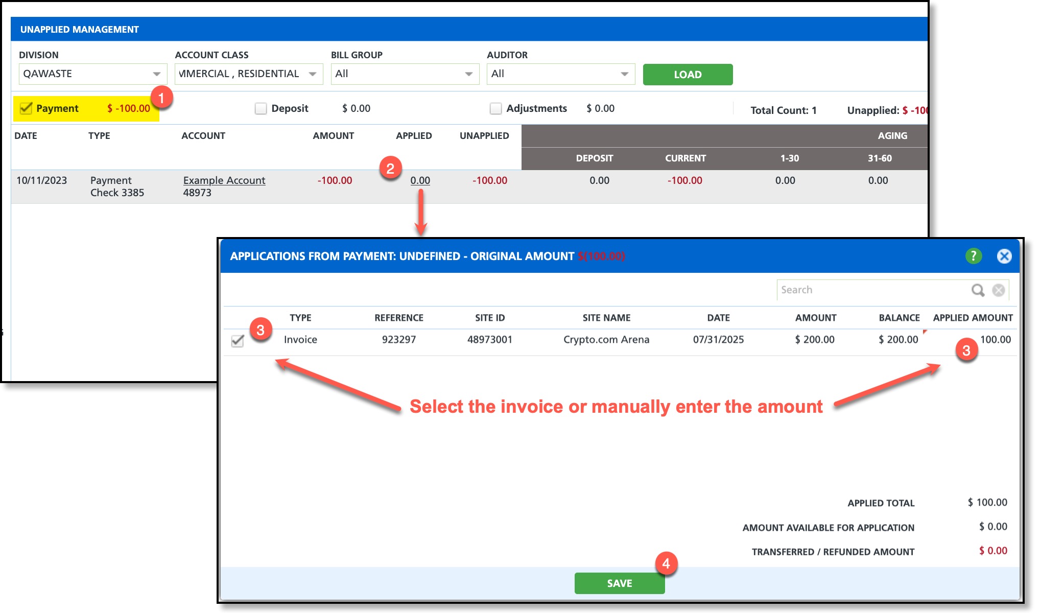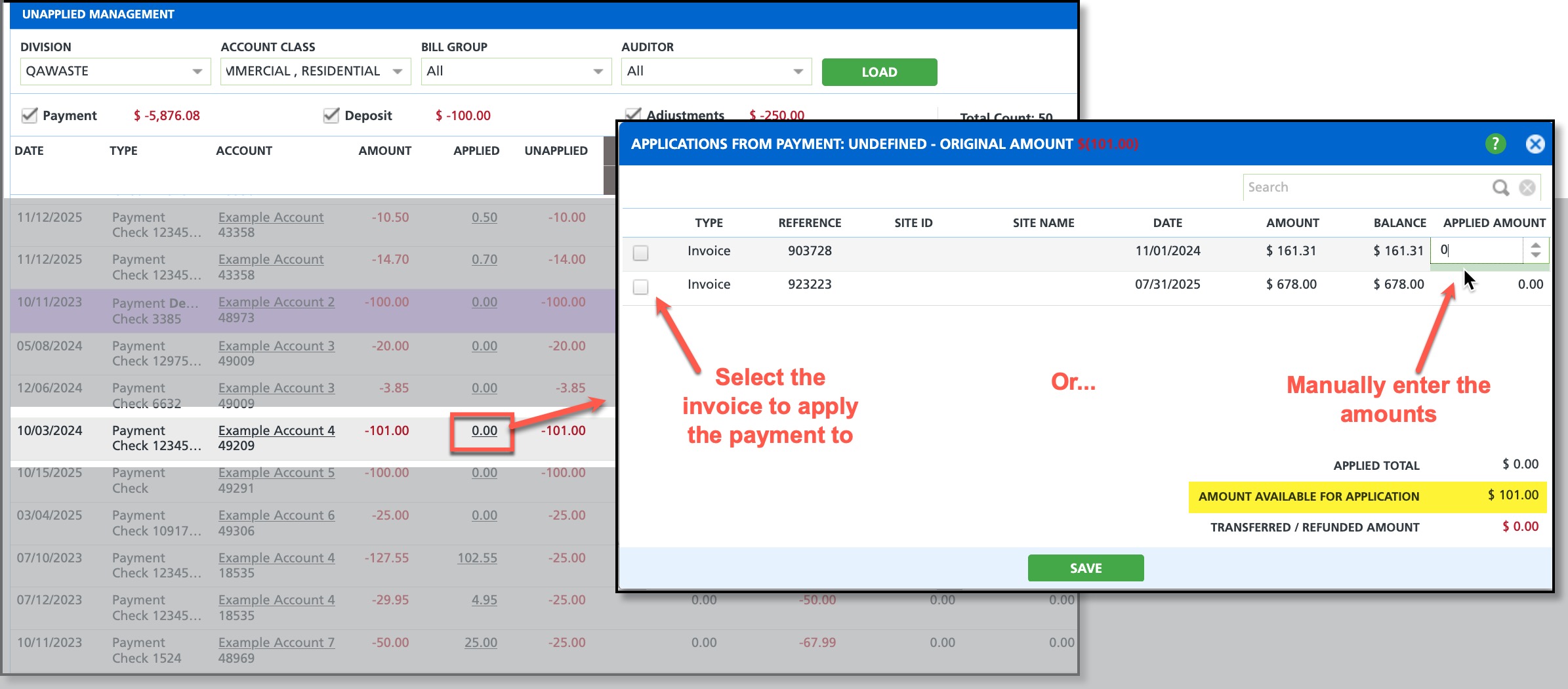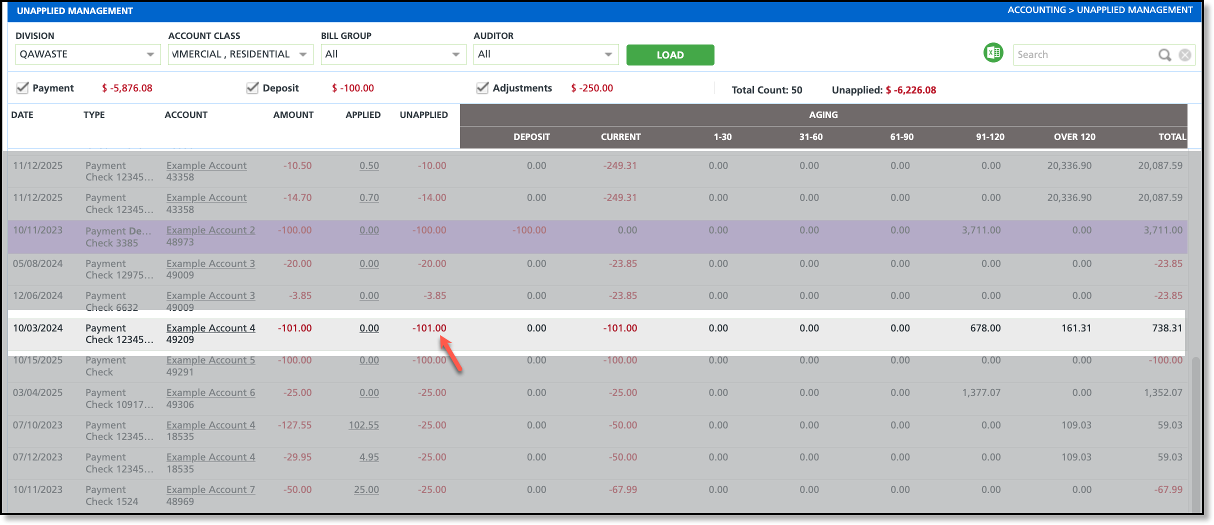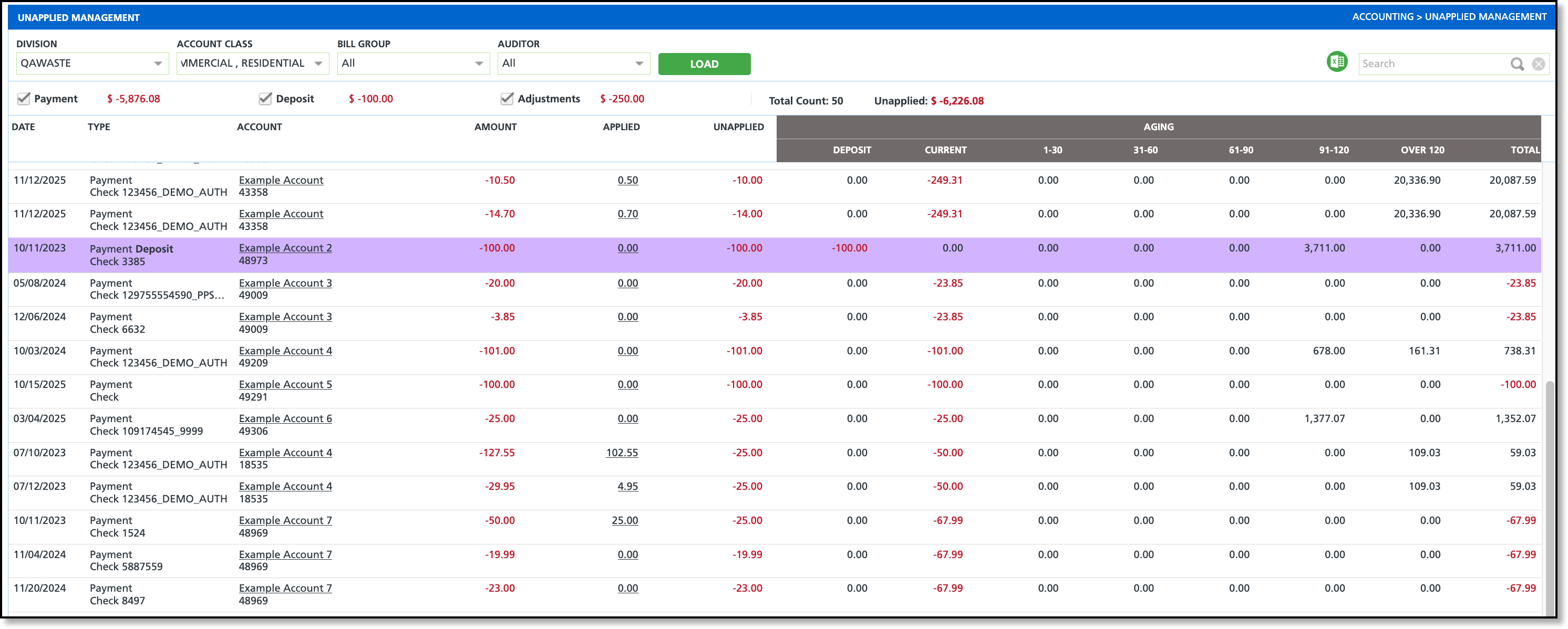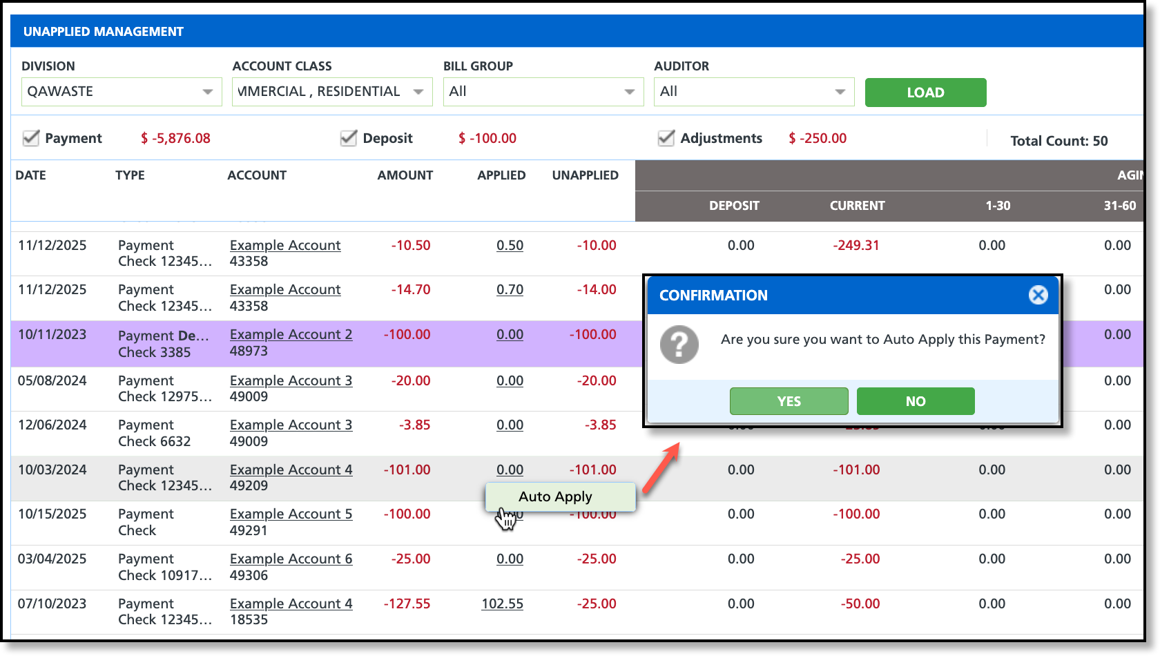 The Unapplied Management screen displays accounting details for payments, deposits, and adjustments that have not yet been applied to an invoice. From this screen, users can apply payments to invoices manually or by using the Auto Apply feature.