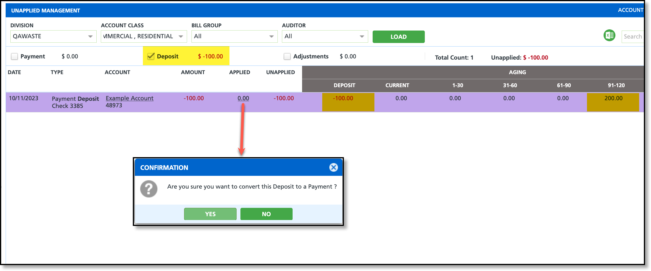 The Unapplied Management screen features the ability to apply deposits to an outstanding balance. By filtering the screen down to only the payment deposits, users can quickly convert a deposit to a payment so it can then be applied to invoice balance. Review the two-step process outlined below to convert a payment and then apply it to an invoice.