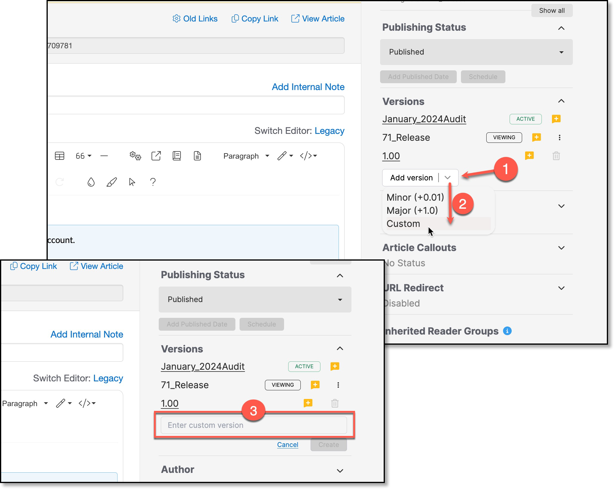 To version an article, select the Add Version (1) drop down located on the right side of the screen and select Custom (2). Then enter the name of the version in the Enter Custom Version field (3).