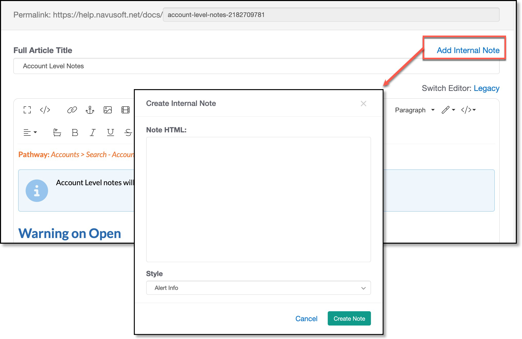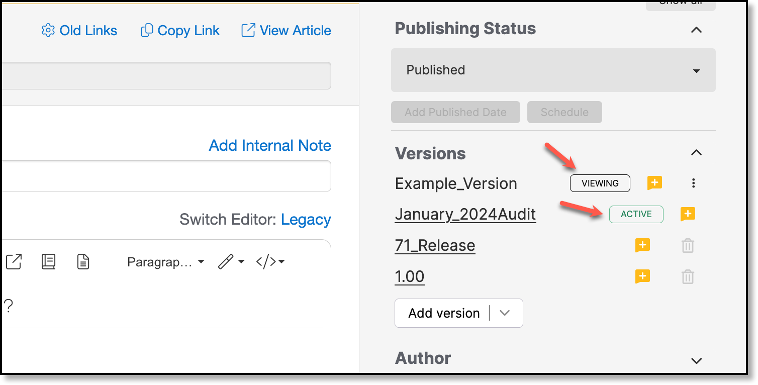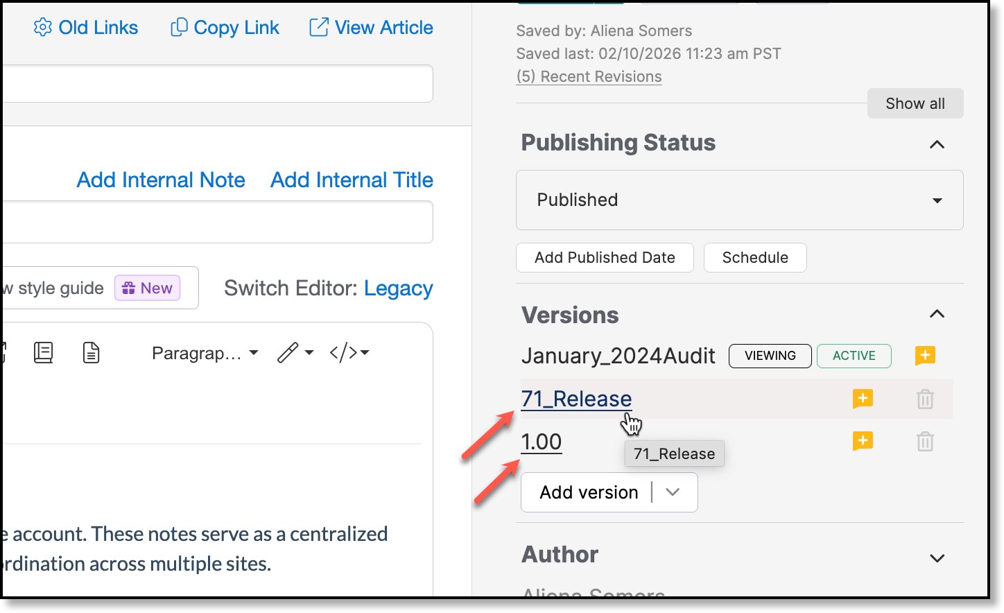 Internal notes are a way to note what you were working on and/or reference JIRA tickets related to the changes being made. Notes entered here are not visible to customers and will carry across versions. For clarity and quick reference later as you are working the article, consider including the applicable release version within the note.